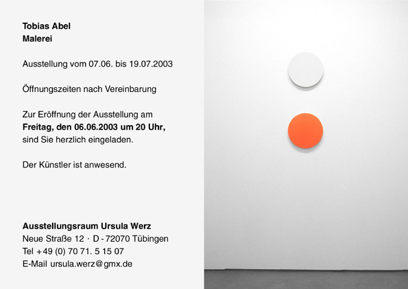 Ausstellungsraum Ursula Werz Ausstellung zeitgenössischer Kunst in Tübingen Tobias Abel - Ausstellungsraum Ursula Werz Neue Str.12 D- 72070 Tübingen Tel. 0049 07071-51507 ursula.werz@gmx.de